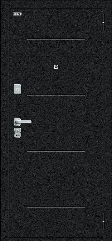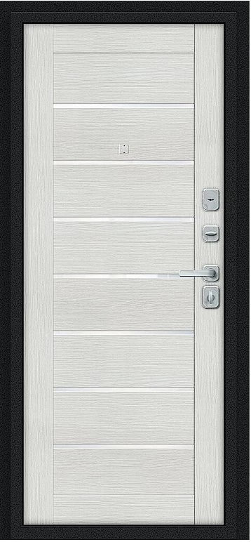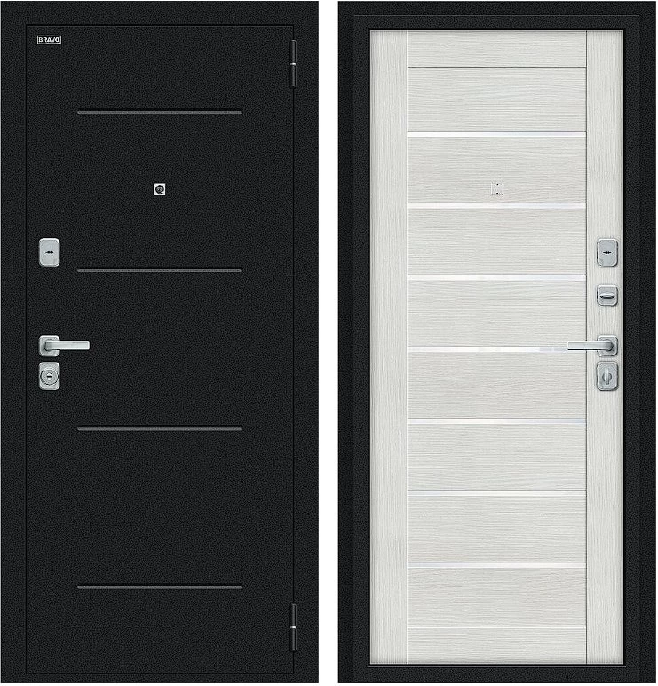 Надежная входная Дверь Браво Техно/BChrome Букле черное/Bianco Melinga премиум класса по цене 34 515 руб. Большая толщина стали защитит от проникновения в ваш дом, квартиру или коттедж. Используется очень качественная фурнитура: замки, цилиндры, ручки, защелки. Покрытие и отделка двери изготовлено под внимательным контролем производителя. Дверь имеет долгий срок службы и гарантию.